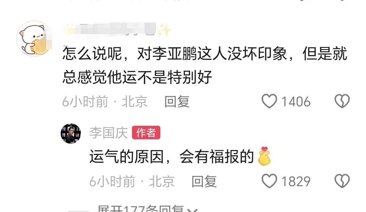 有网友说,李亚鹏这个人就是总感觉运气不好,李国庆在评论区回复网友,运气的原因,会有福报的。