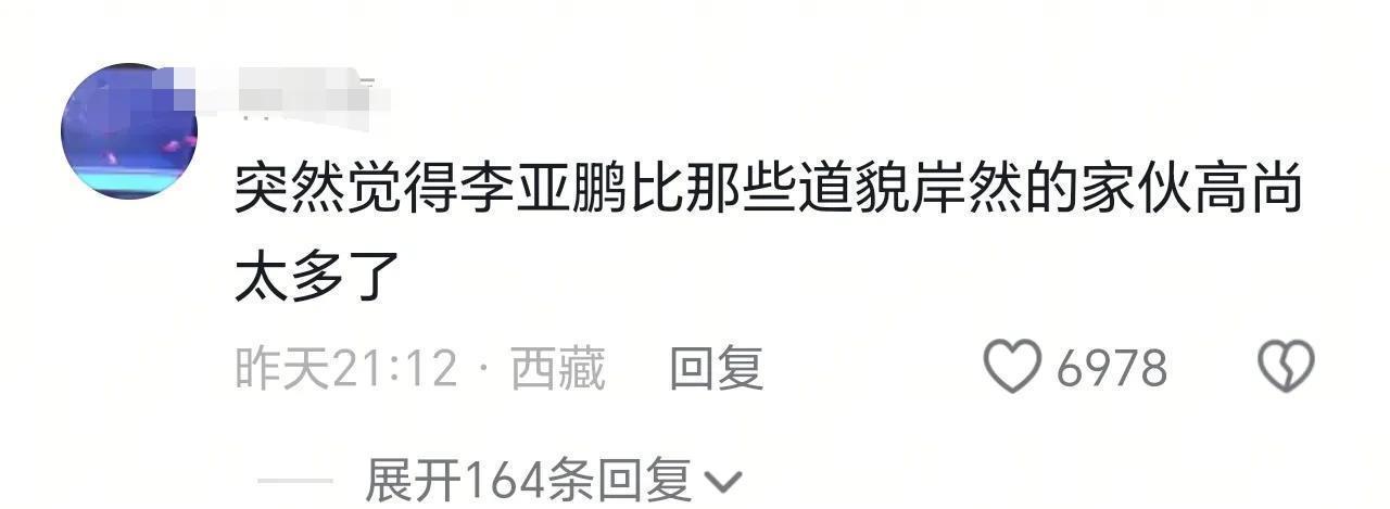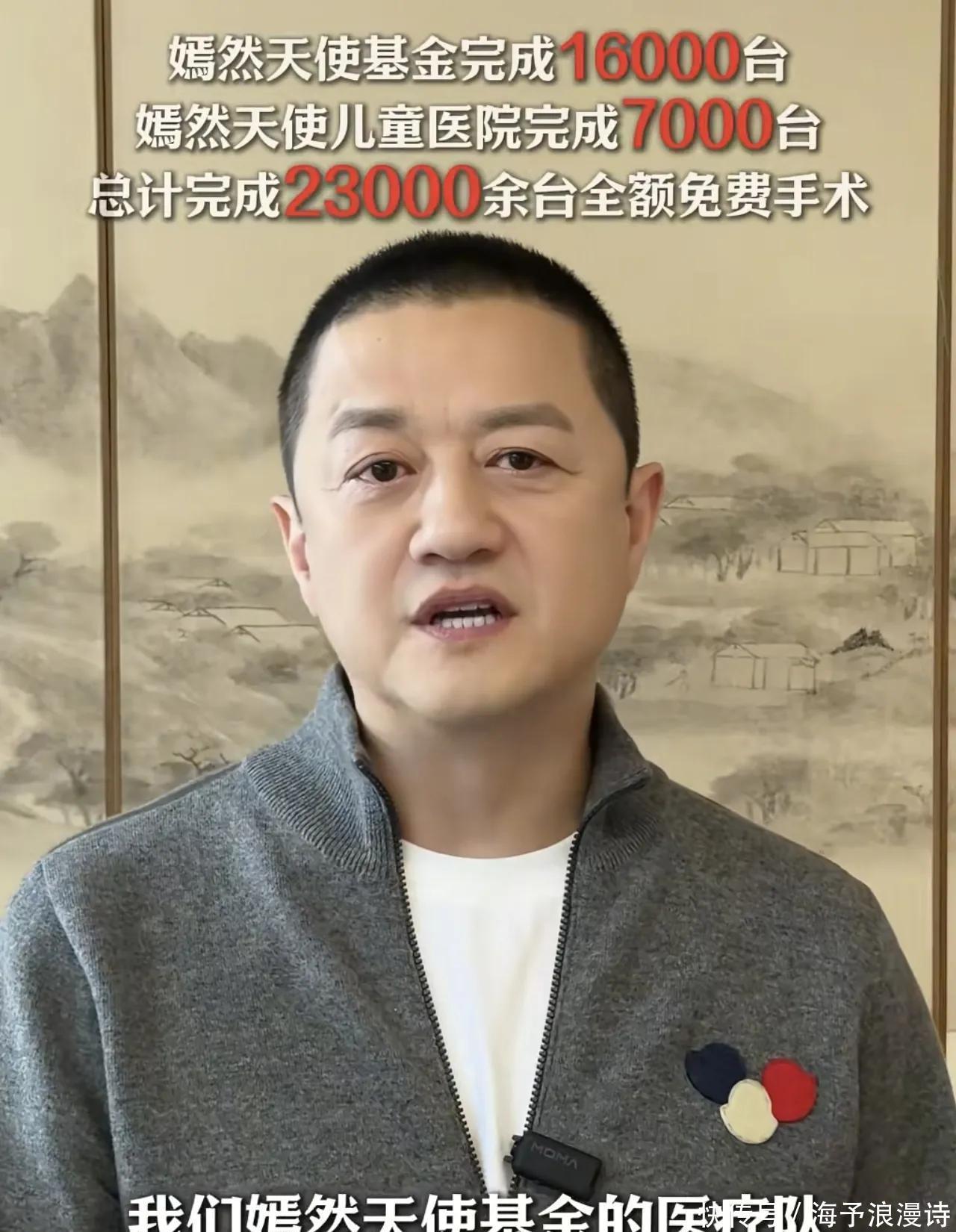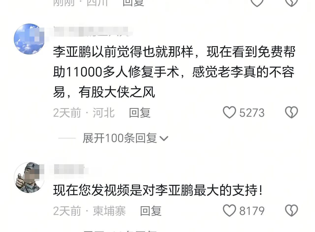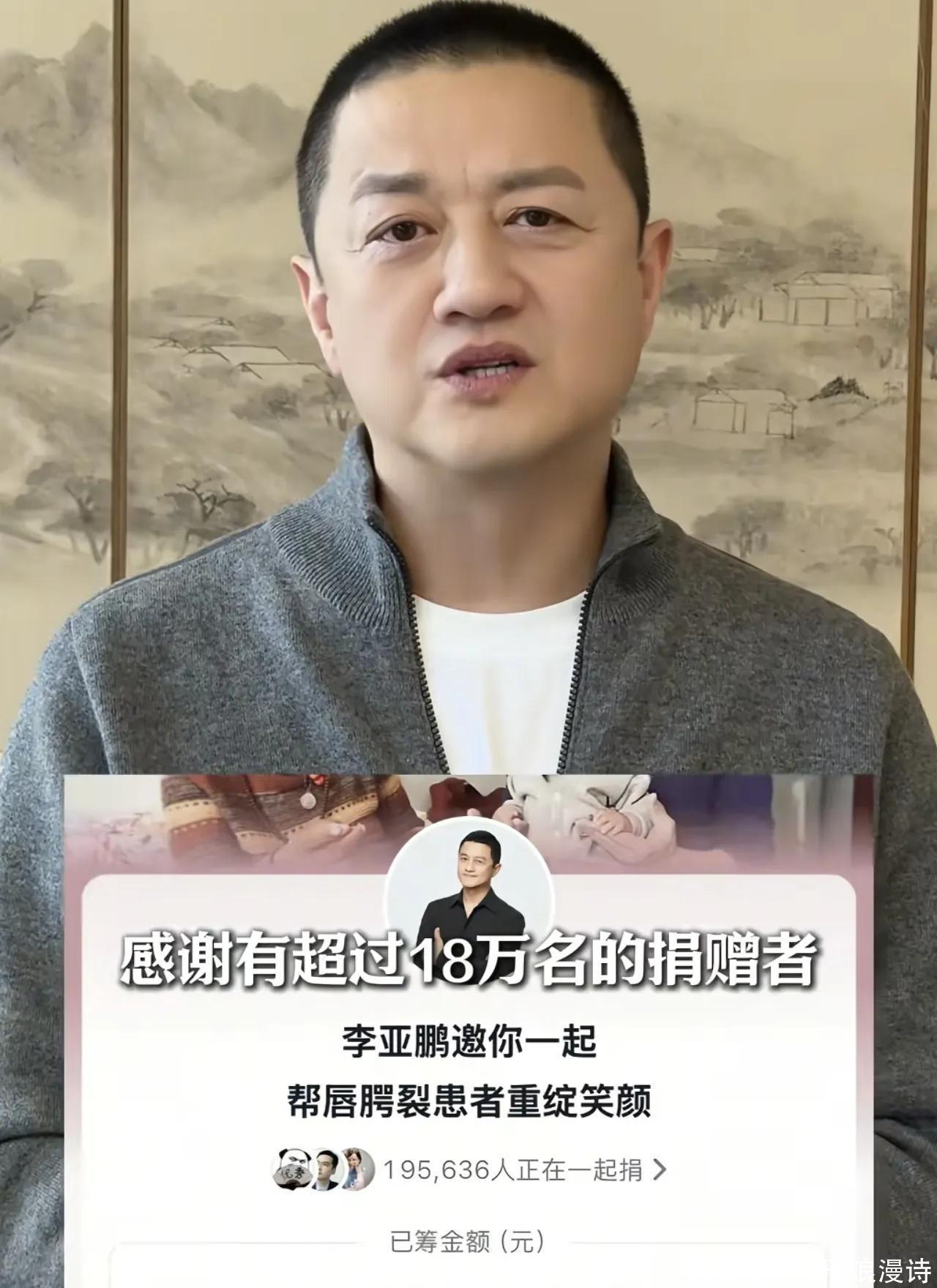 有网友说,我是一名口腔医生,我明白一个唇腭裂的救治加康复的过程,非常的艰辛复杂,李亚鹏真是大爱无疆。有网友评论,当你发现一个人水平很高,但是又不太成功的时候,那么这个人一定是道德水平太高。有网友粗略的算了一下,900多万能实施1000个手术,目前已经进行了1.6万个患者,也就是投入了十几亿,而且是免费治疗,真的是人间大爱。也有网友劝李亚鹏卖一点接地气的东西,比如买一点年货之类的,或者是食物之类的。写在最后现在的网友越来越清醒了,他们不再追星,不再追捧网红,而是支持像韩红、李亚鹏这样的人相信在大家的支持下,嫣然天使基金一定会渡过难关,让更多有需要的儿童得到救治。李亚鹏可称之为先生,人间大义,圈里的人,我第1个佩服的是韩红,第2个敬佩的就是李亚鹏。